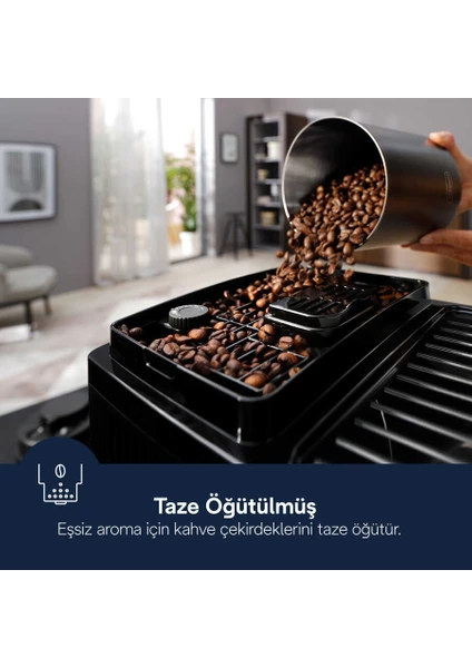Tam Otomatik Sistem: Dahili profesyonel öğütücüsü sayesinde her fincan için çekirdekleri anında öğütür. Böylece kahveniz her zaman en taze ve aromatik haliyle fincanınıza ulaşır.
